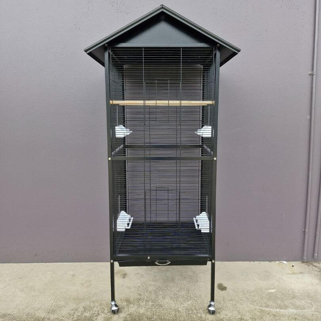 Square Patio Style Cage with Solid Roof. Included four plastic double feeders.