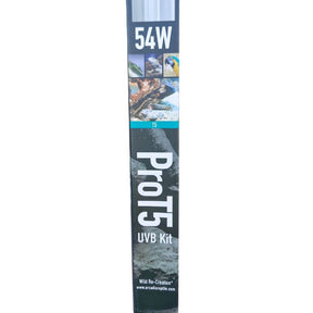 Complete overhead lighting solution for large cages, indoor flights and aviaries. Kit contains ProT5 fixture with integrated electronic ballast, 54 W T5 bird lamp, curved reflector and switched power lead.
