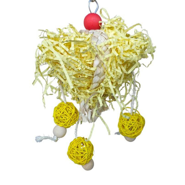 This cheerful toy is packed with yellow crinkle paper and fun dangling balls, perfect for stuffing with treats and shredding into bits. A bright and enriching boredom buster for playful birds!