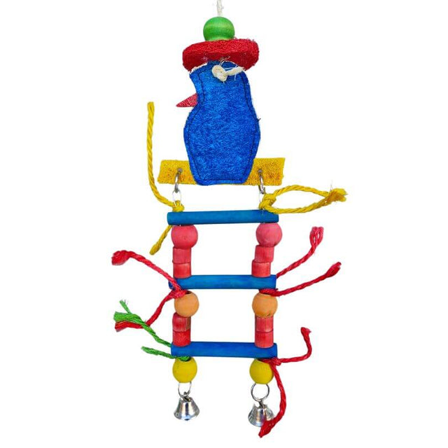 A fun coloured Loofa Bird Shape with dangling wood blocks. Perfect for chewing and play for small birds. Hanging on a sisal rope.