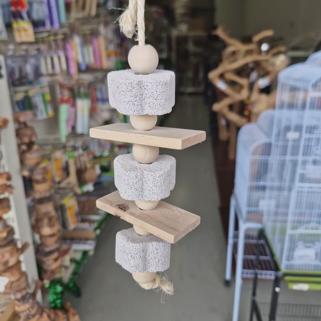 The Pumice Nibbler is great for keeping beaks trimmed as they nibble on the pumice and wood slices that hang on a sisal rope.