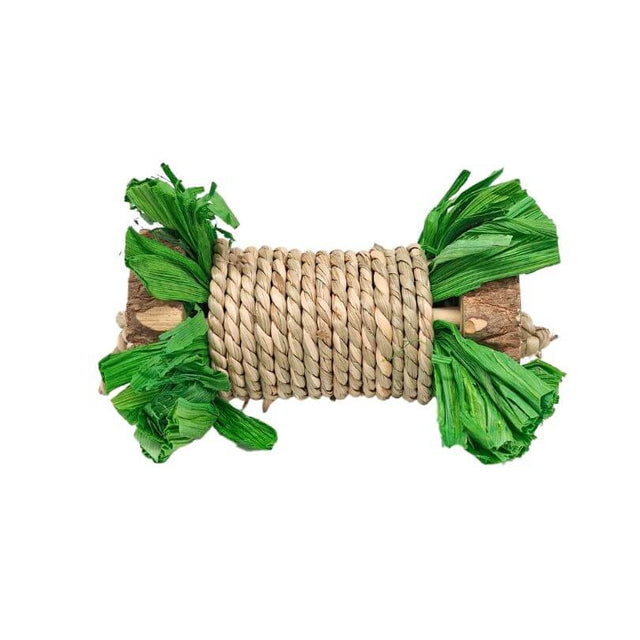 Two chunks of wood on either end with seagrass and pine between. There is lots of space to stuff treats inside with green corn husk on either end.