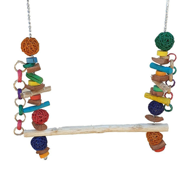 The Giant Java Parrot Swing is a large swing with wicker balls, coconut slices and java wood blocks along each side. Complete with a strong chain and quality clips for easy hanging.