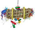 Seagrass roll stuffed with colourful shredded paper. On the outside, it has thick cardboard rolls and dangling sisal rope with wood blocks. You could also add some treats inside for extra enrichment and foraging.