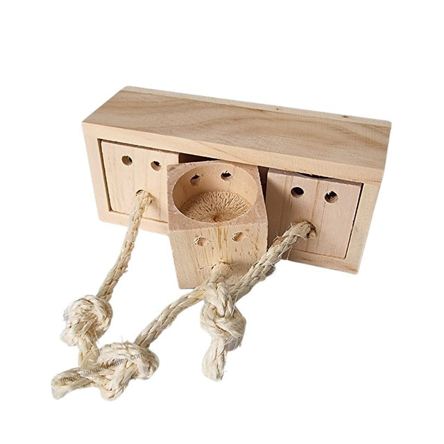 Small wooden box with three pull-out cubes for hiding treats. We recommend using this toy when you're interacting with your bird out of the cage. A great training tool that is suitable for small to large birds. The rope is made from bird-safe sisal. Remove when not in use.