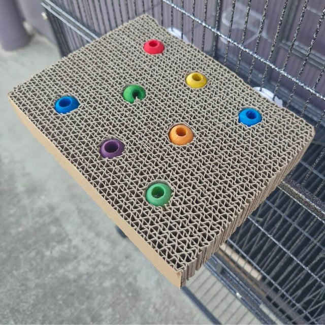 A new style of platform perch, this thick block of cardboard easily attaches to the side of your bird's cage with a wing nut and hard plastic washers. Birds love to hang out on flat surfaces, just ensure it is not the highest thing in your bird's cage. Remember to remove the support poles when chewed or destroyed.