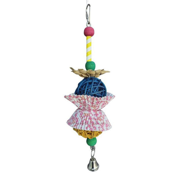 The Cupcake Wicker Chew toy is a cute little chew toy made with two wicker balls and cupcake paper chews and straws. A fun and colourful chew toy to add to your bird's toy rotation to keep them interested and entertained.