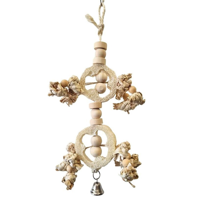 Two chewable loofa slices are hanging on a bird-safe sisal rope with extra nibble seagrass pieces. Also great for Conures!
