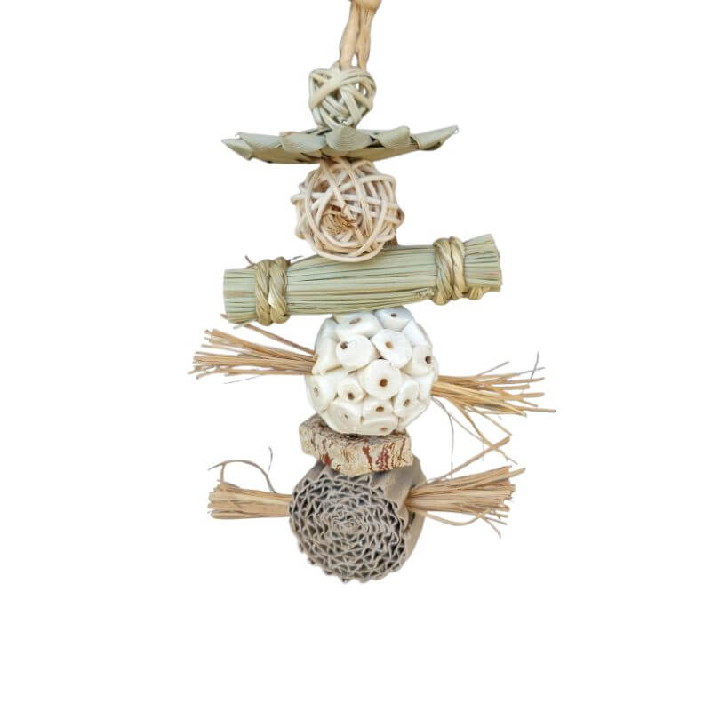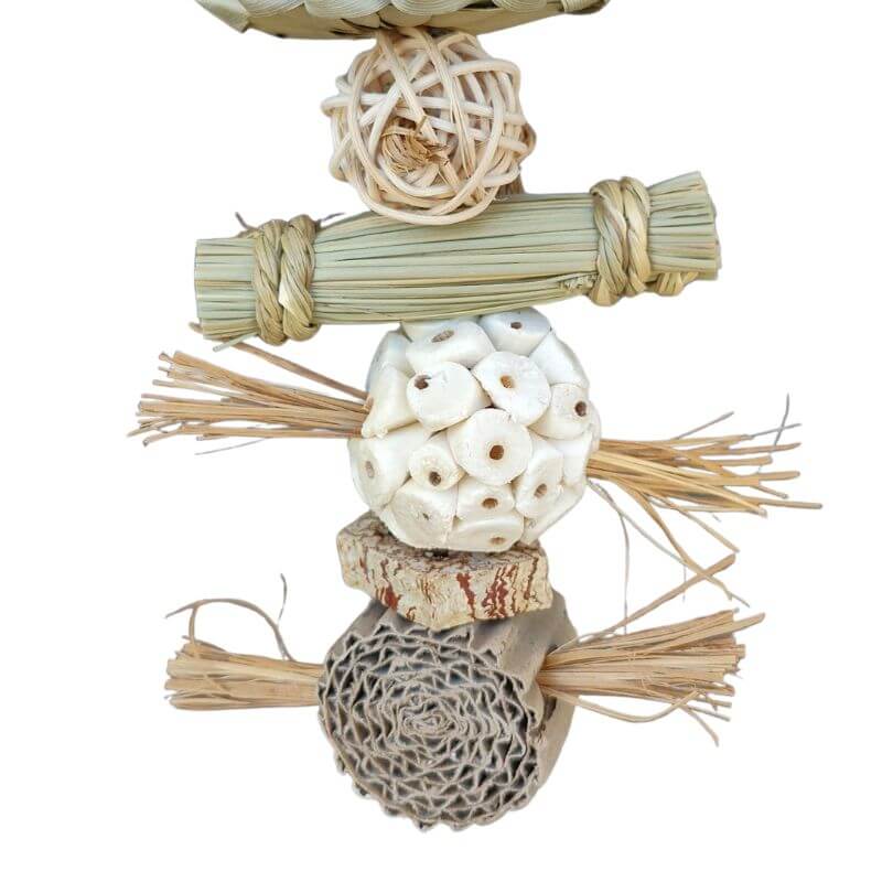 This mini chew toy is made with a cardboard roll, sola ball, reed bundle, wicker ball, and palm star. Packed with different textures, it’s perfect for small birds that love to nibble, chew, and explore while staying busy in the cage. Hook is wood.