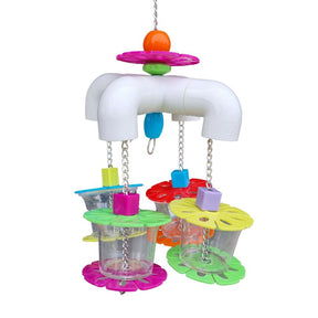 Four dangling easy-to-clean cups that can be filled with dry or fresh treats. When one cup is pulled the other side moves up or down making it harder for your bird to forage. Suits birds with moderate to advanced foraging skills.