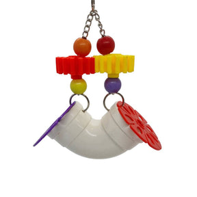 Elbow-shaped PVC pipe with colourful beads. A great all-around forager with plastic toy discs covering each end.