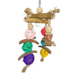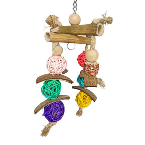 This exciting hanging toy features bamboo tubes, vibrant wicker balls, dried corn cobs, and coconut shell pieces, all strung together on sturdy jute rope.