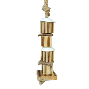 Swinging from a braided jute string are blocks of natural wood, coconut shells, and sea shells, perfect for tiny beaks that love to explore and chew.