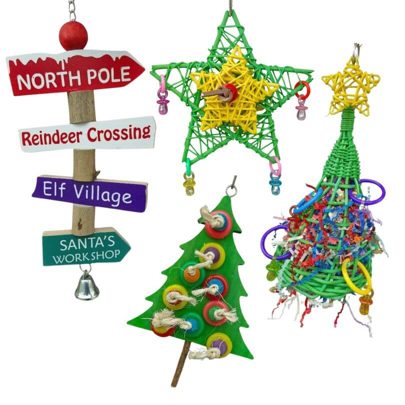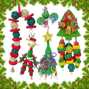 Celebrate the holidays with this 8 piece Christmas bundle made especially for medium to large parrots. Featuring a festive mix of Java wood and wicker toys, this bundle offers plenty of textures to chew, climb and explore. It is perfect for keeping curious beaks busy all season long.