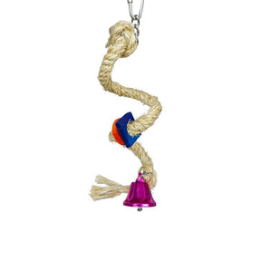 One of our smallest toys, made for the little guys like Budgies, Parrotlets and Lovebirds. Made from a flexiable wire, wrapped in jute rope with tiny wood slices and a bell.