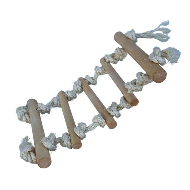 The Mini Step Bridge by All Pet Avian Care comes with two larger main wooden supports on either end of the bridge. The whole thing is tied together with a sisal rope and it has wooden rungs suspended along the bridge. This bridge easily attaches to your bird's cage with the wing nuts and washers.