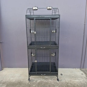 This cage is commonly used by breeders as a weaning cage. It features a double-story design, saving space while offering easy mobility with the included stand and wheels. A convenient bottom shelf provides extra storage, and the play gym on top adds extra fun. The metal tray and side doors allow for easy access.