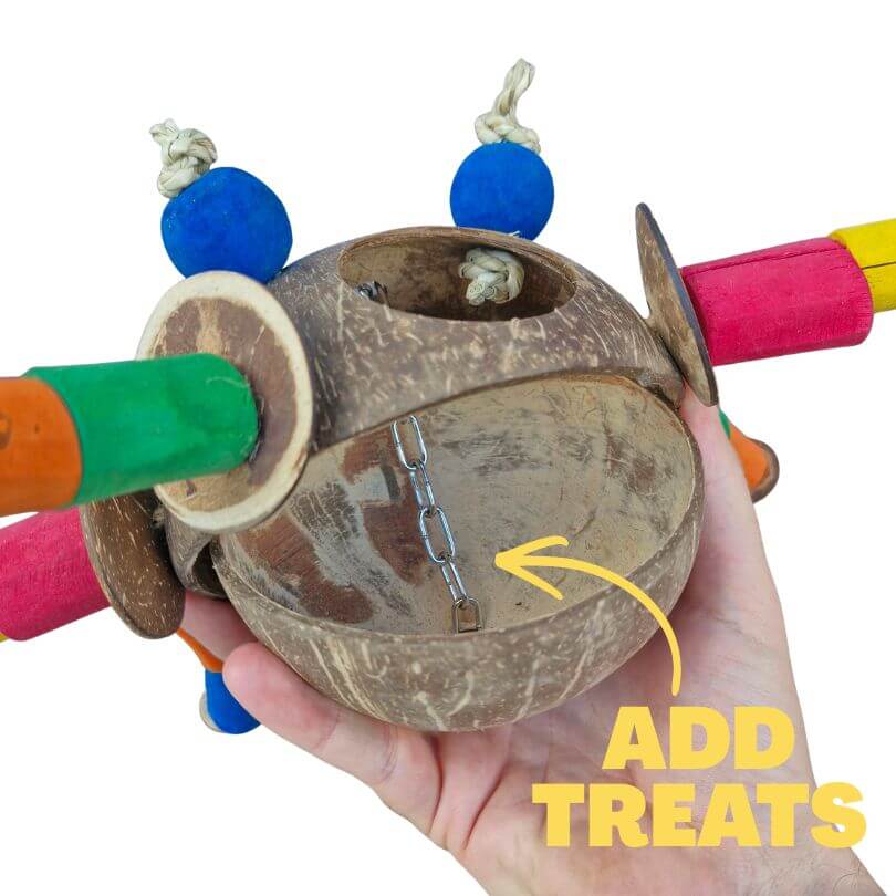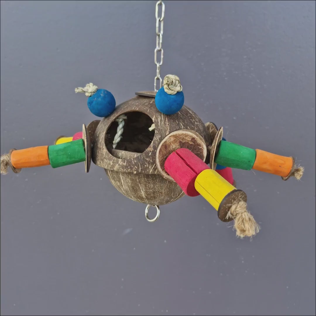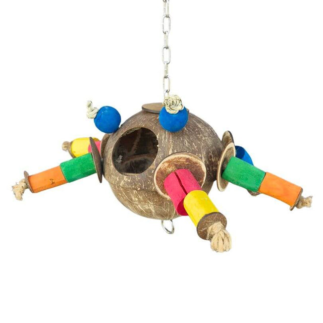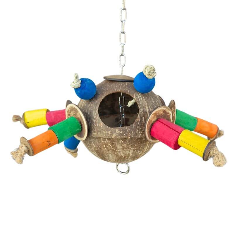Made from a thick coconut shell with durable java wood legs, it is built to handle regular use. Hangs from a strong chain and is easy to add to any cage or play area.