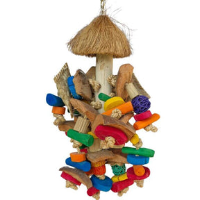 It’s five o’clock somewhere, so that means there’s time for some chewing fun! This Java Tiki Tower by Ninos Java is made with a thick Java wood pole topped with a half coconut and lashings of colourful java wood blocks, corn cobs, wicker balls, palm parcels and coconut shell.
