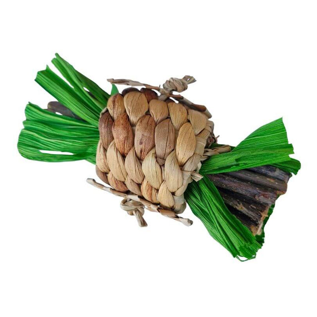 Natural apple sticks wrapped in corn husk, hyacinth and seagrass. An irresistible chew and play foot toy, birds love to toss, shred and nibble.