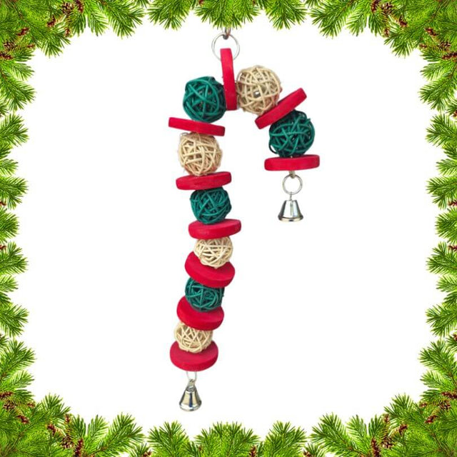Add a festive twist to your bird's space with this chewable candy cane toy! Made from strong java wood discs in classic holiday colours, it's perfect for keeping your feathered friend entertained and engaged. Two jingly bells add extra holiday cheer to this delightful toy.