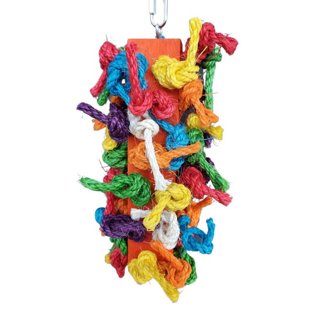 Wooden block with colourful knots of bird-safe sisal rope. A popular fun toy for birds that like to preener and suitable for feather pluckers.