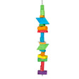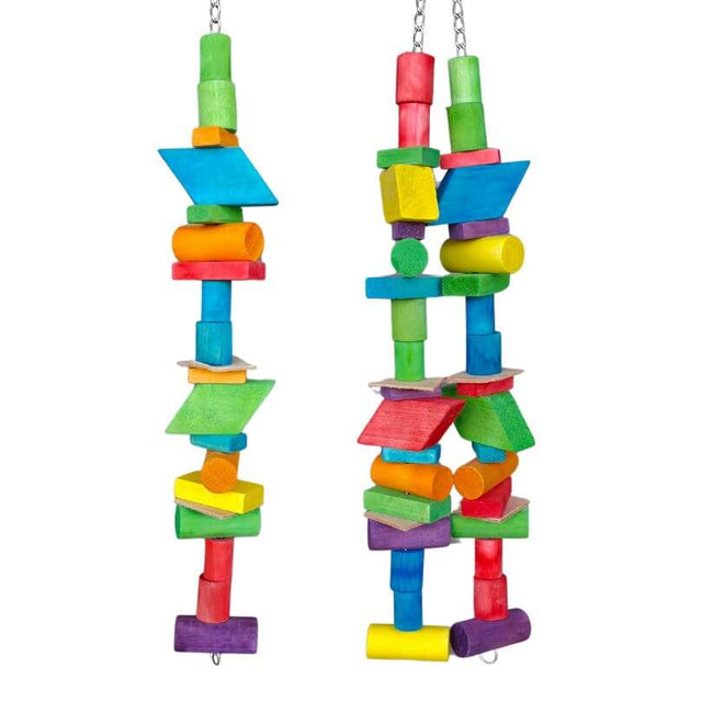 Chunky blocks of wood and leather squares hang from a hefty chain. Crafted from medium-hardness Pinewood and coloured with natural vegetable dye for safe chewing. A sizeable toy approximately 58cm long, make sure you have enough space to hang it.