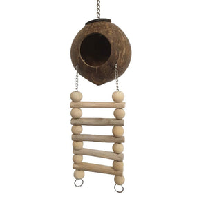 Coconut House is a fun climbing toy made from a hollowed-out coconut with a Java wood ladder attached by a hanging chain. It’s a great addition to any bird setup and perfect for small species like Lovebirds and other playful companions.