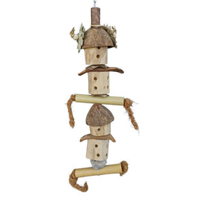 A natural chew and foraging toy featuring solid wooden trunks with small holes for hiding treats, along with half coconut shells, bamboo tubes, mahogany shells and pumice. Perfect for birds who love to chew and forage!