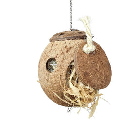 Let your bird go nuts on this strong coconut foraging toy. A whole coconut with a strong hanging chain and side flaps for stuffing treats. It comes pre-filled with natural foraging material.