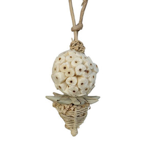 A sola ball sits atop a woven wicker cone, filled with crinkled shredded paper for added foraging fun. Perfect for small birds who love to chew, shred, and explore!