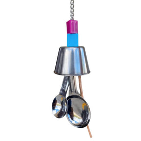 Super strong metal spoons hanging from a metal cup and strong chain. Also has two leather straps with plastic beads.