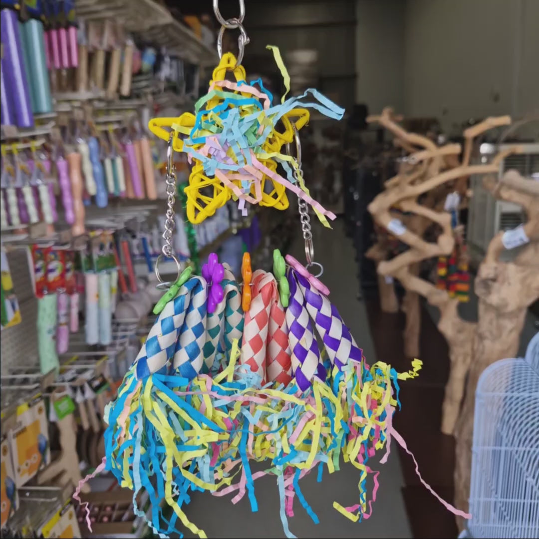 It’s a colourful explosion of fun! This star-shaped hanger is loaded with woven tubes and vibrant crinkle paper to satisfy your bird’s shredding instincts - a true party in a toy!
