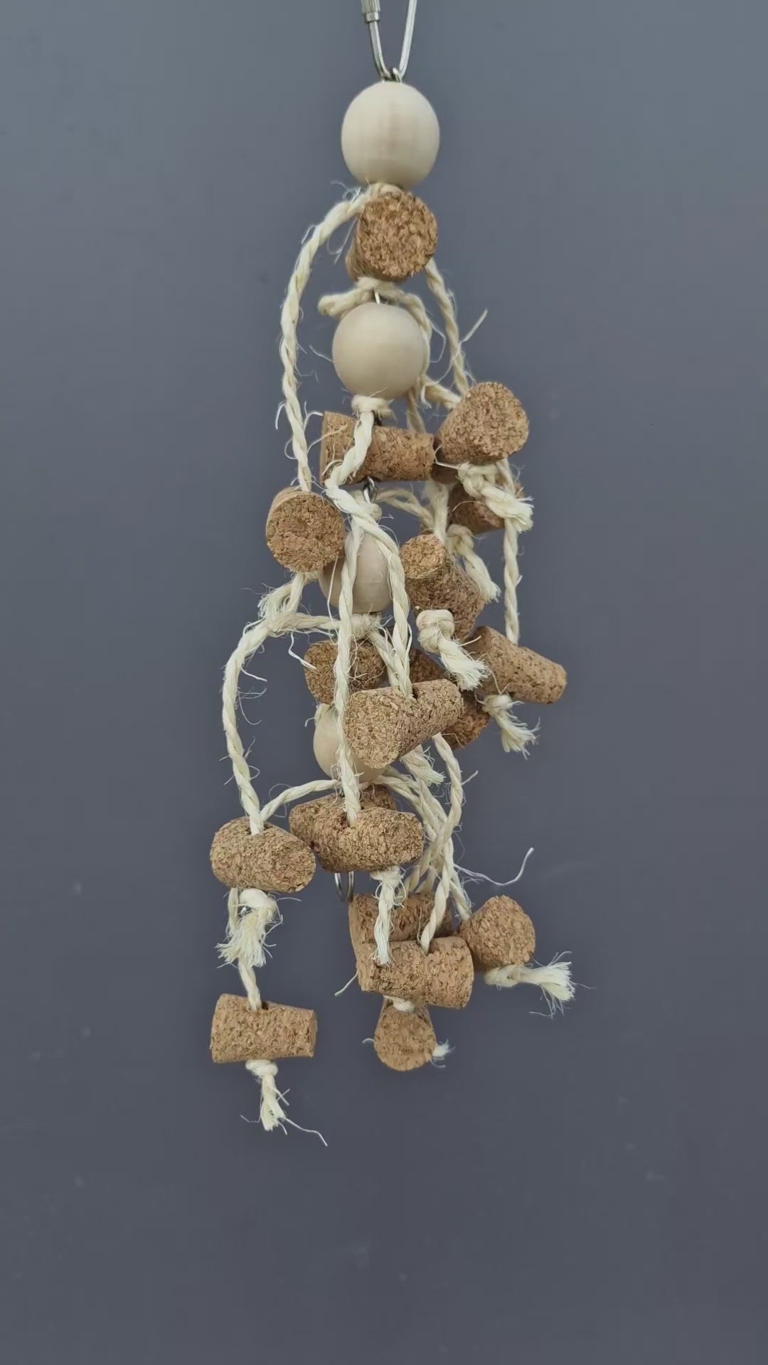 The Cork Chaos toy is a chaotic jumble of wooden beads and sisal rope tipped with shreddable corks.