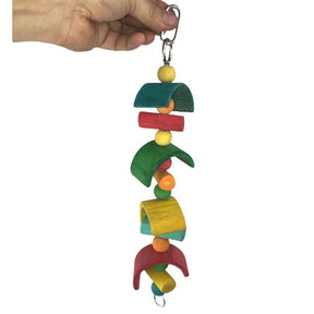 The Java Halfmoon Glider is made with thick hanging Java wood blocks and beads. Java wood is one of the toughest natural bird-safe woods available and is sustainably sourced. This toy, both small and large, is perfect for birds that chew and destroy. It hangs from a sturdy quality chain.