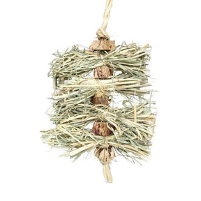 Four mini bunches of fresh Aussie-grown Foraging Grass with Mahogany Slices. Hanging on a sisal rope. Perfect for small birds that love to preen and nibble.