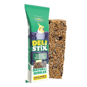Deli Stix Natural Nibbles are a vet-formulated treat bar combining seasonal fruits, nuts, seeds, and Parrot Essentials pellets. Perfect for smaller parrots but loved by all, it offers balanced nutrition and enrichment in one hanging snack!