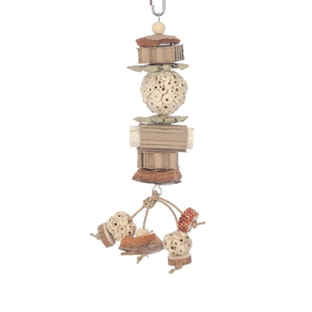 This hanging nibble toy is made with sola, coconut slices, cardboard honeycomb, and dangling mini sola balls. It’s designed for nibbling and shredding, giving birds lots of texture to explore while keeping them busy and entertained.