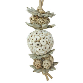 A small kabob-style toy with palm leaf stars, sola balls and mini wicker balls. Made for little beaks that love to nibble and chew.