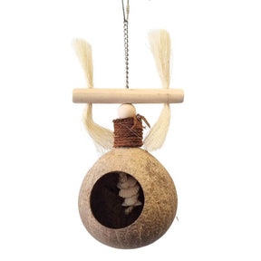 It is a hanging hollowed-out coconut with seashells and a wood and sisal tassel on top. We recommend using some Foraging Grass to stuff inside. Add your bird's favourite treats to entice them further.