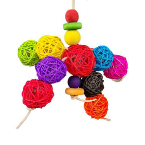 The Funky Wicker Dangle is a brightly coloured toy sure to brighten up any cage. Wicker balls hang on leather ropes with a few coloured beads. This toy is made for chewing and play. A great way to keep your bird occupied.