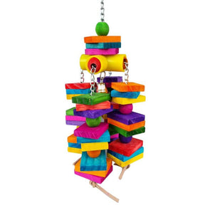 Four-way hanging coloured wood blocks and beads, dangling on chain. With a plastic four way tube and leather tassels at the end. A decent-sized toy that will require room to hang.