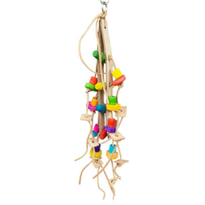 Folded leather strap with wooden tubes and long dangling leather tassels. A fun chew-and-play toy for smaller birds. A long toy so perfect for small spaces.