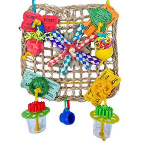 Featuring a palm star center, colourful wicker hearts, carnival tickets, woven tubes, bagel rings and dangling cups for stuffing treats, it offers plenty of chewing and foraging.