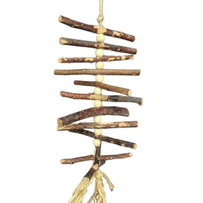 Dangling Apple sticks, made for chew and play. Apple sticks are a safe and chewable wood for all parrots. Hanging on a sisal rope and is suitable for small birds like Budgies, Cockatiels, Conures and Quakers.