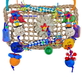Attaching to the side of your bird's cage, this toy features a thick seagrass mat with a palm star center, decorated with colourful wicker hearts, plastic beads, carnival ride tickets, sola balls, woven tubes, and dangling stuffable balls. Perfect for chewing, foraging, and interactive play!