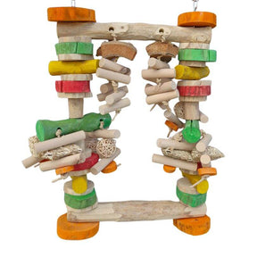 This oversized Java swing is packed with fun! Measuring 50cm tall by 32cm wide, it features colourful Java wood blocks, woven parcels, wicker balls, and coconut slices to keep your bird entertained.