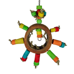 The Coco Java Wheel is perfect for birds that love to chew. This bird toy is made with a coconut ring and colourful java wood blocks, all hanging on a strong chain. A great addition to your birds toy rotation to keep things interesting and entertaining.