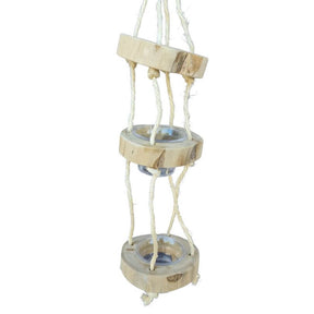 Fun new foraging toy perfect for beginners! Two levels made from strong Java wood with a clear plastic cup that can filled with your bird's favourite treats. Suspended from a Java wood top and sisal rope. Also great for Lorikeets as you can add Wet Lorikeet Blend, and the cup is easily removed and cleaned.