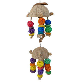 Featuring two coconut half-shells with dangling strands of woven rattan balls, wooden blocks, and natural rope, this toy offers plenty of chewing and tugging fun. The bottom dangles from a mahogany shell, with raffia flowing from the center for extra shredding excitement.